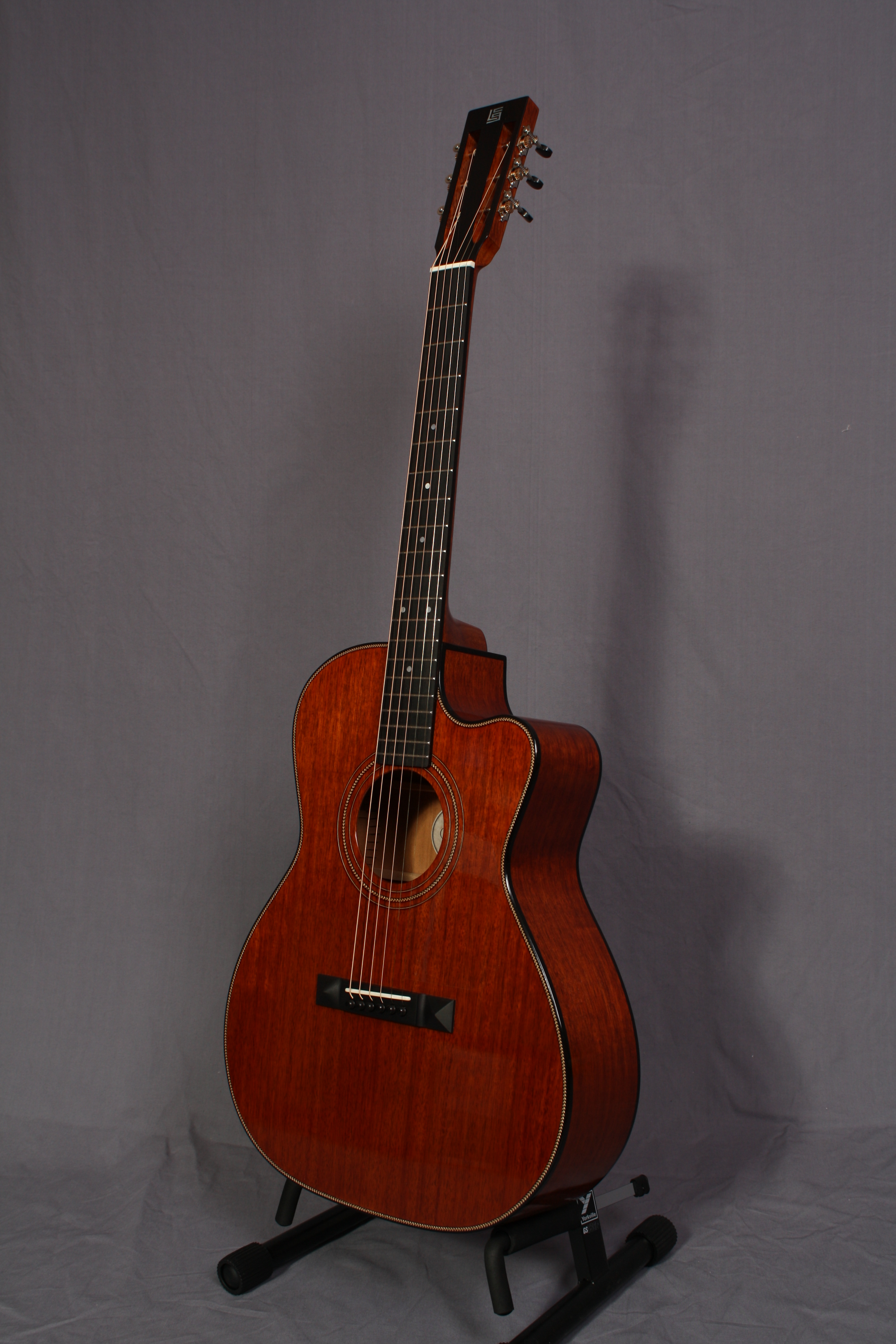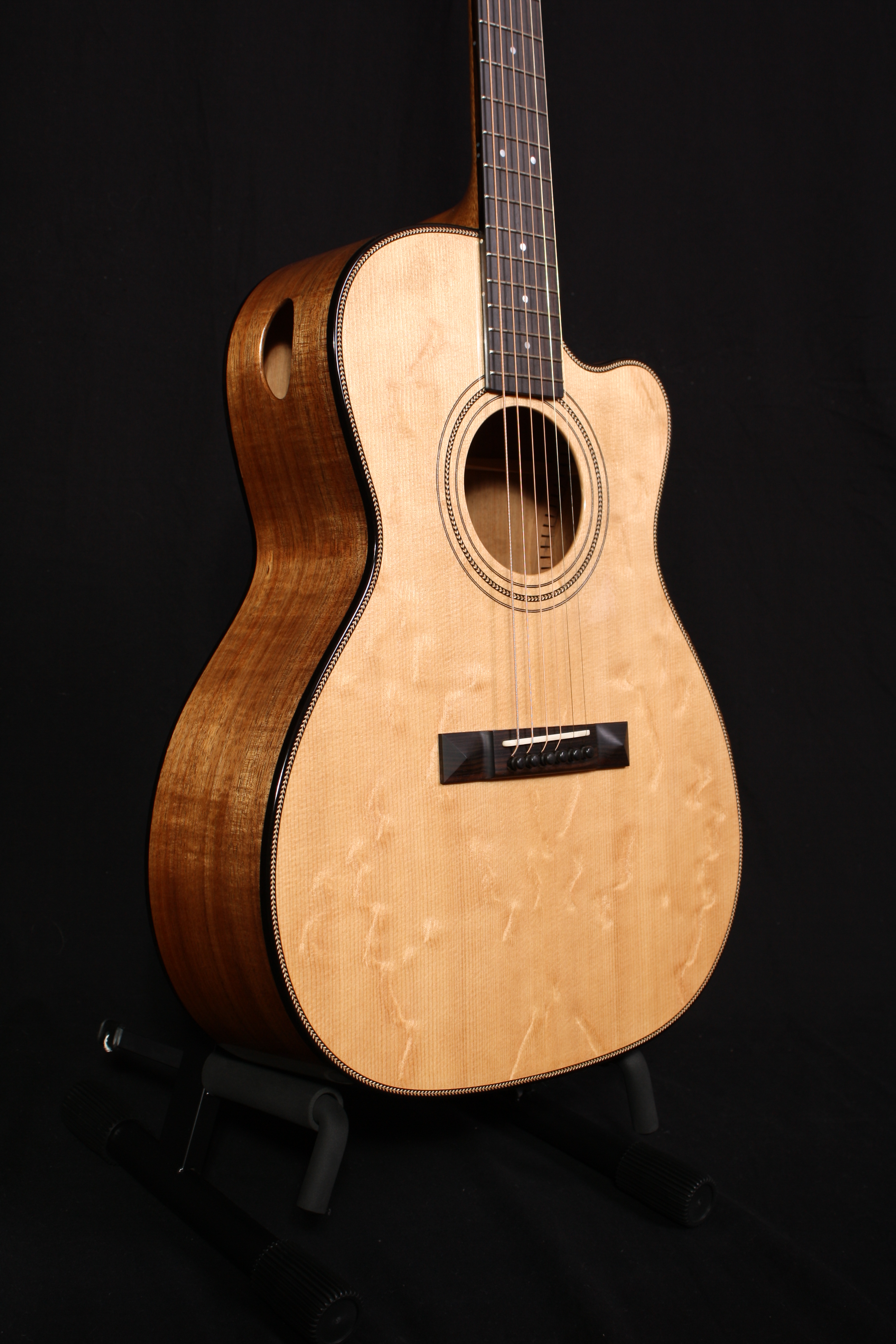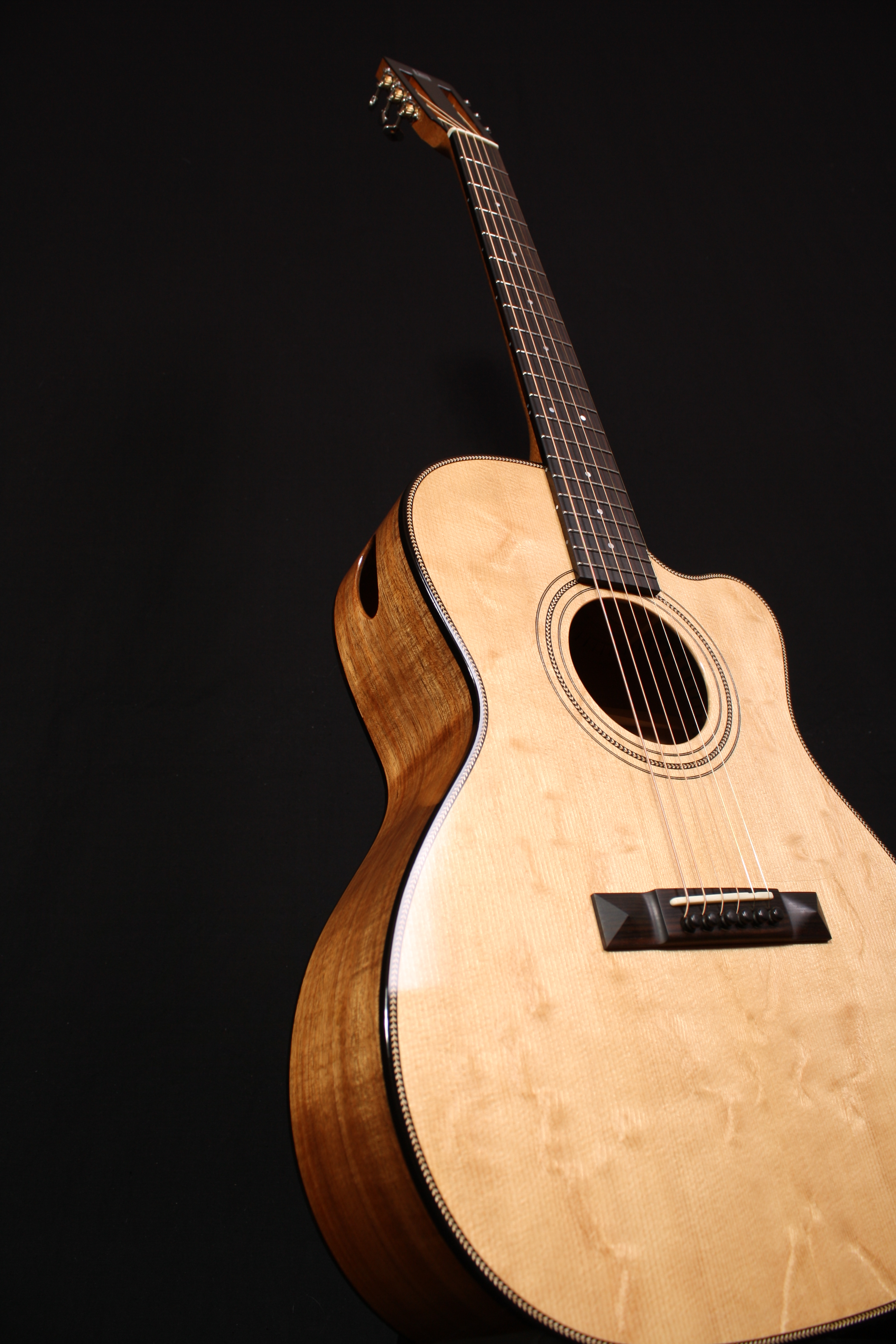My Concert Model is of my own design but can be thought of in the same realm as a Martin OM. I build this model with 24.9″ or 25.4″ scales, 14 or 13-fret neck locations, solid or slotted pegheads, venetian cutaway or not, etc…