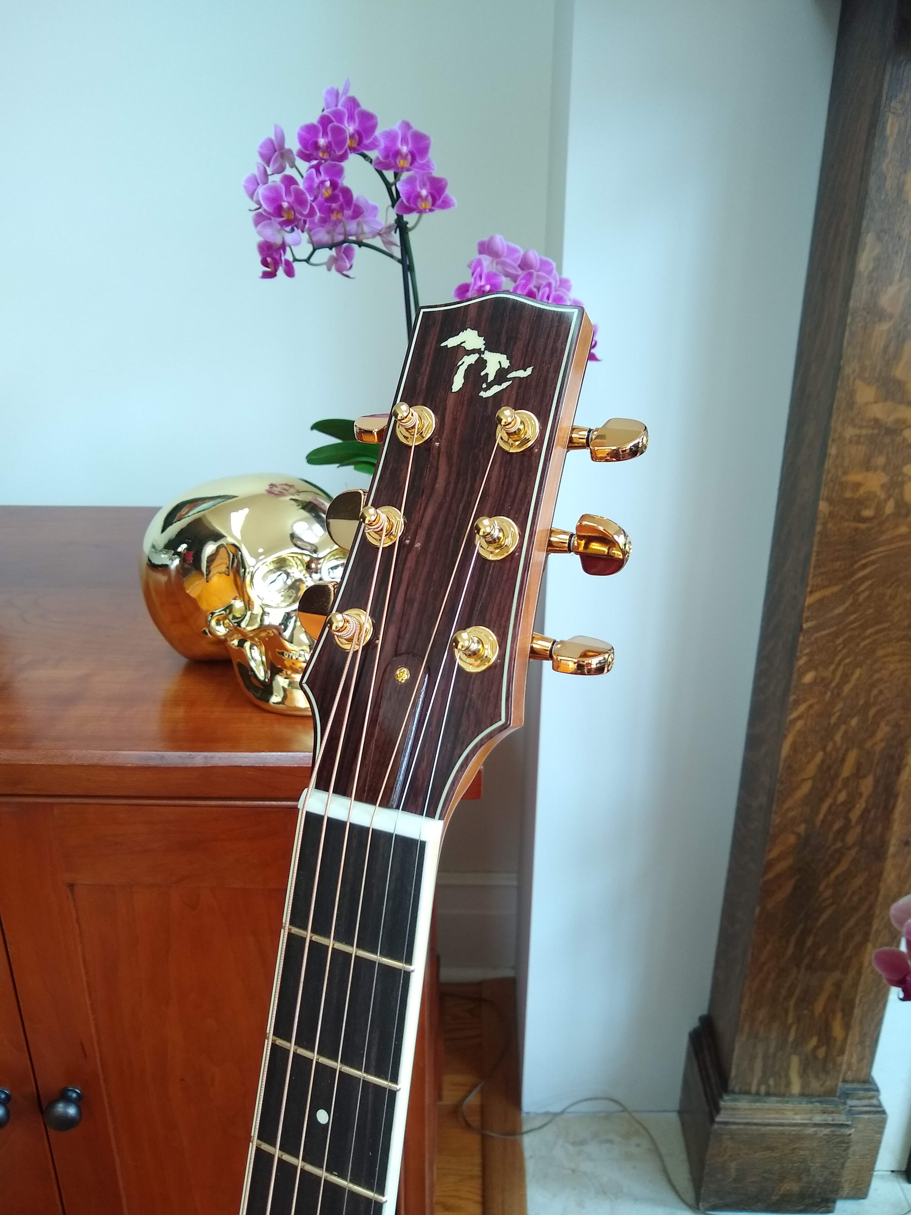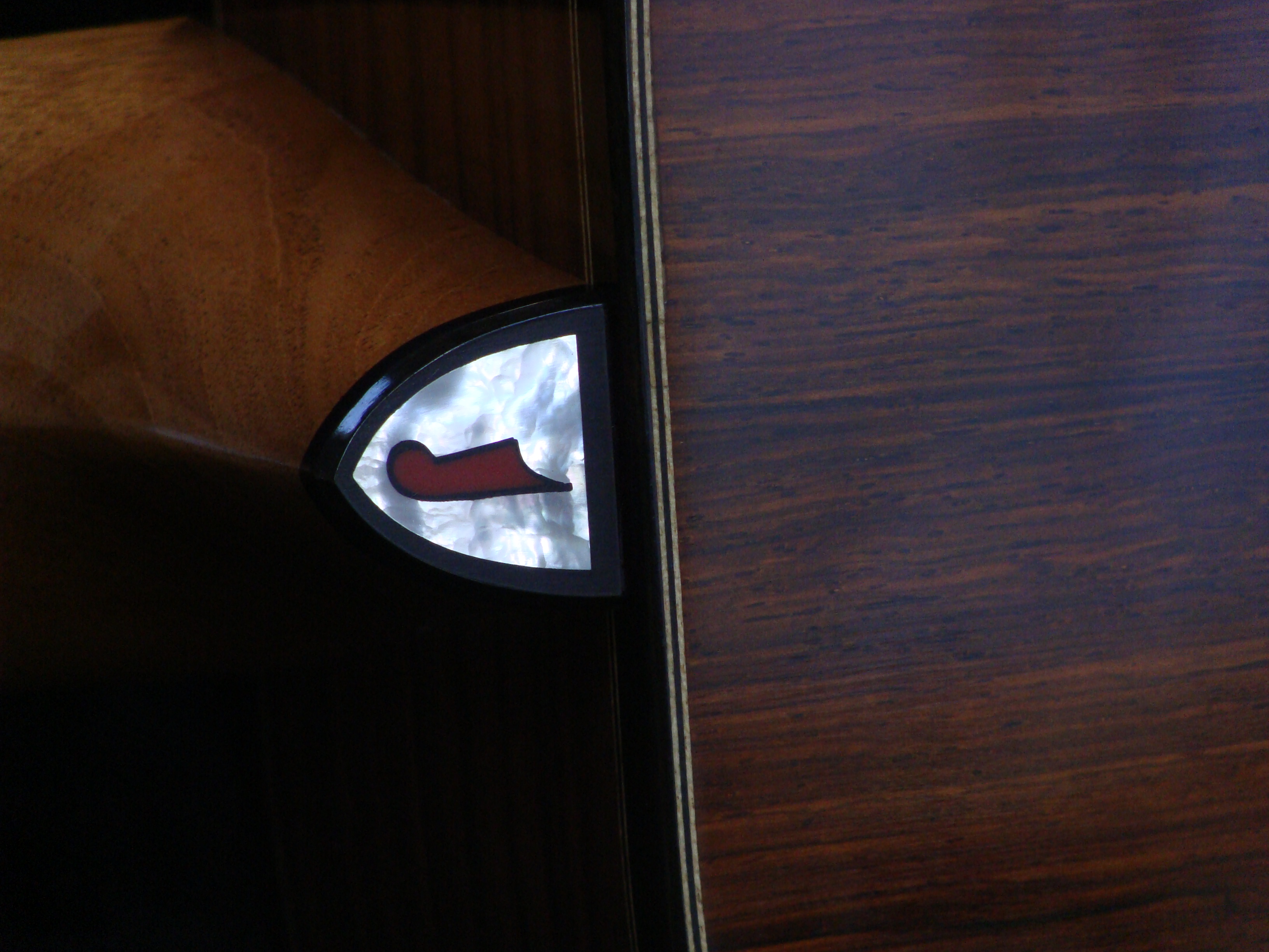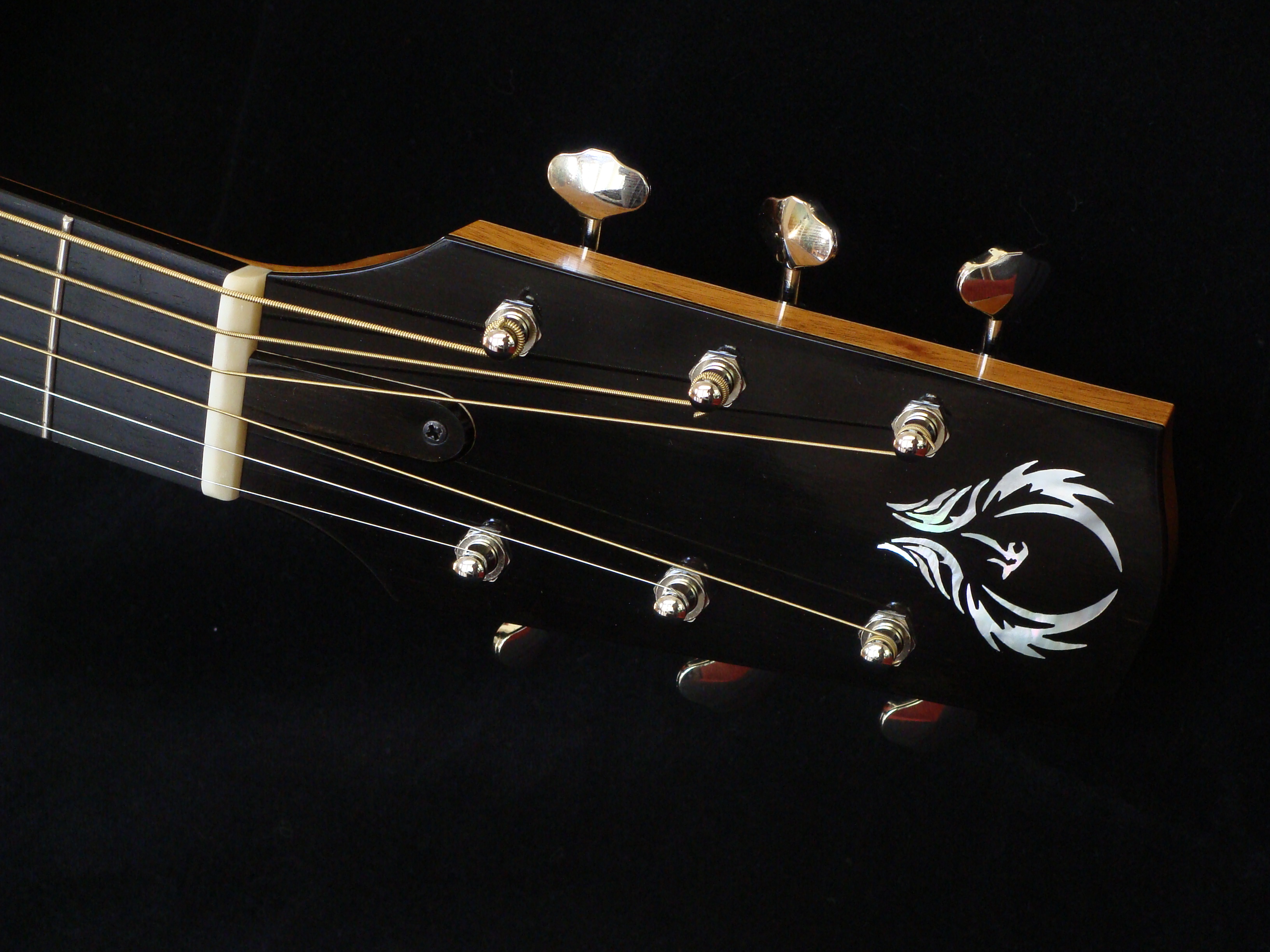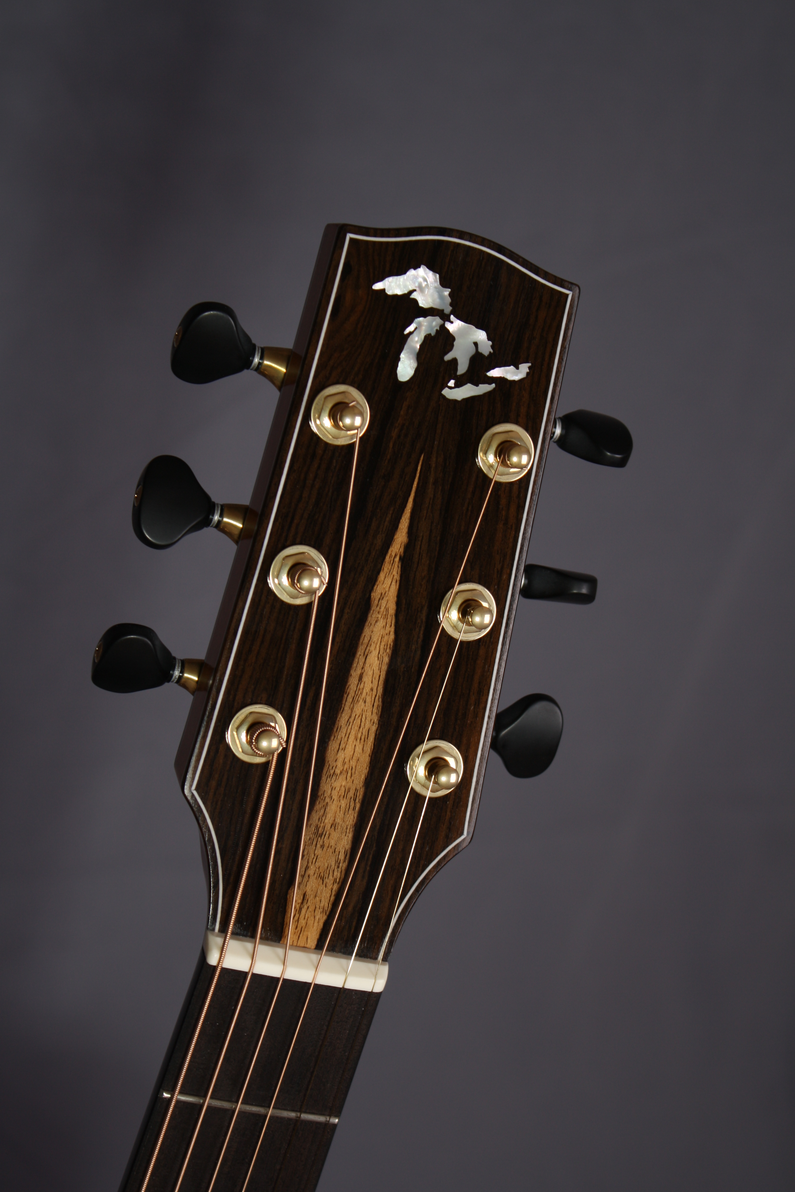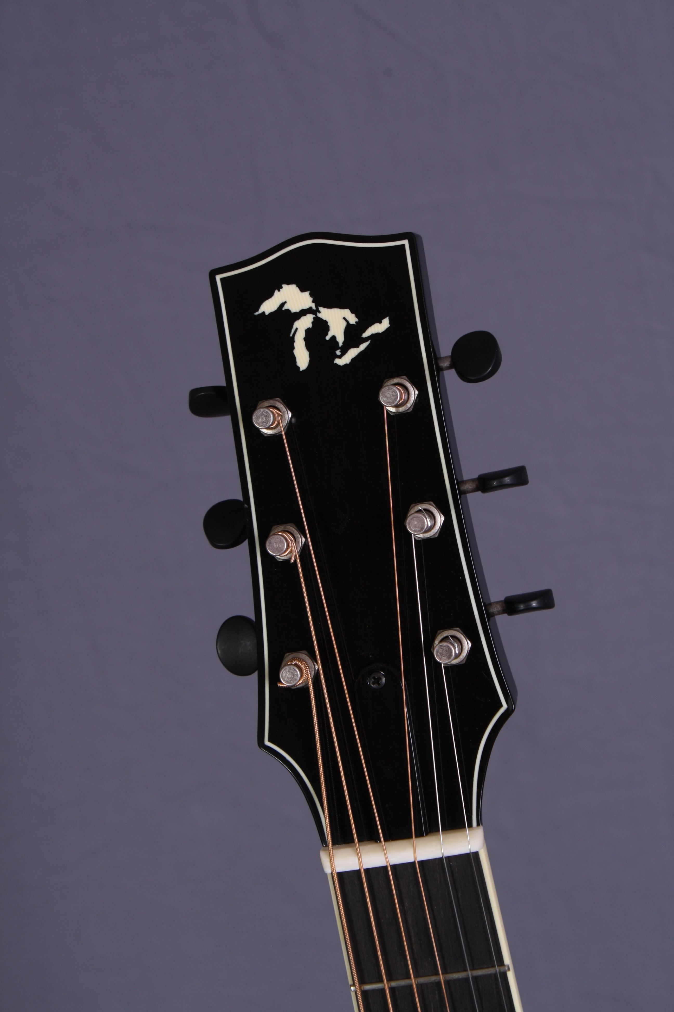 I usually adorned my steel string headstocks with a depiction of the Great Lakes, in pearl, plastic or reconstituted stone but also did some custom on-off designs. Most often I used a French Polish shellac finish but I did sometimes spray. It was always an extra pleasure to tailor the guitar to the desires of the player, from aesthetic choices like these, to the woods used, and also neck dimensions and profiles.