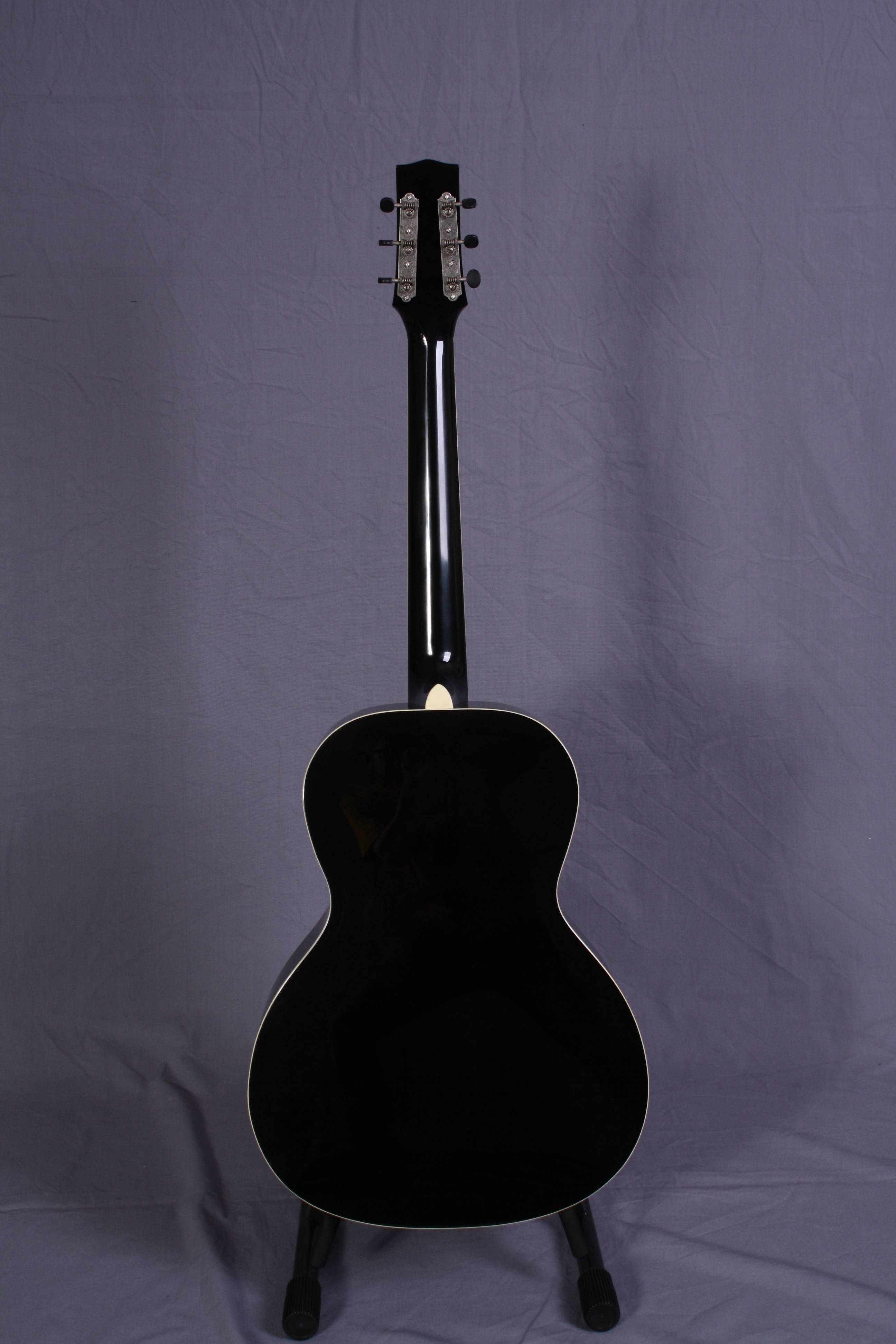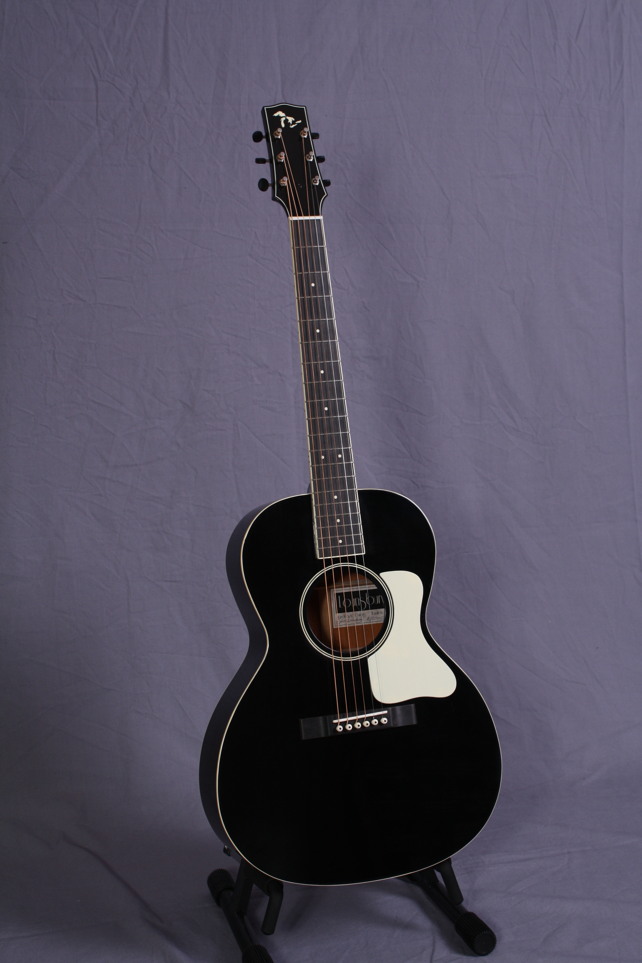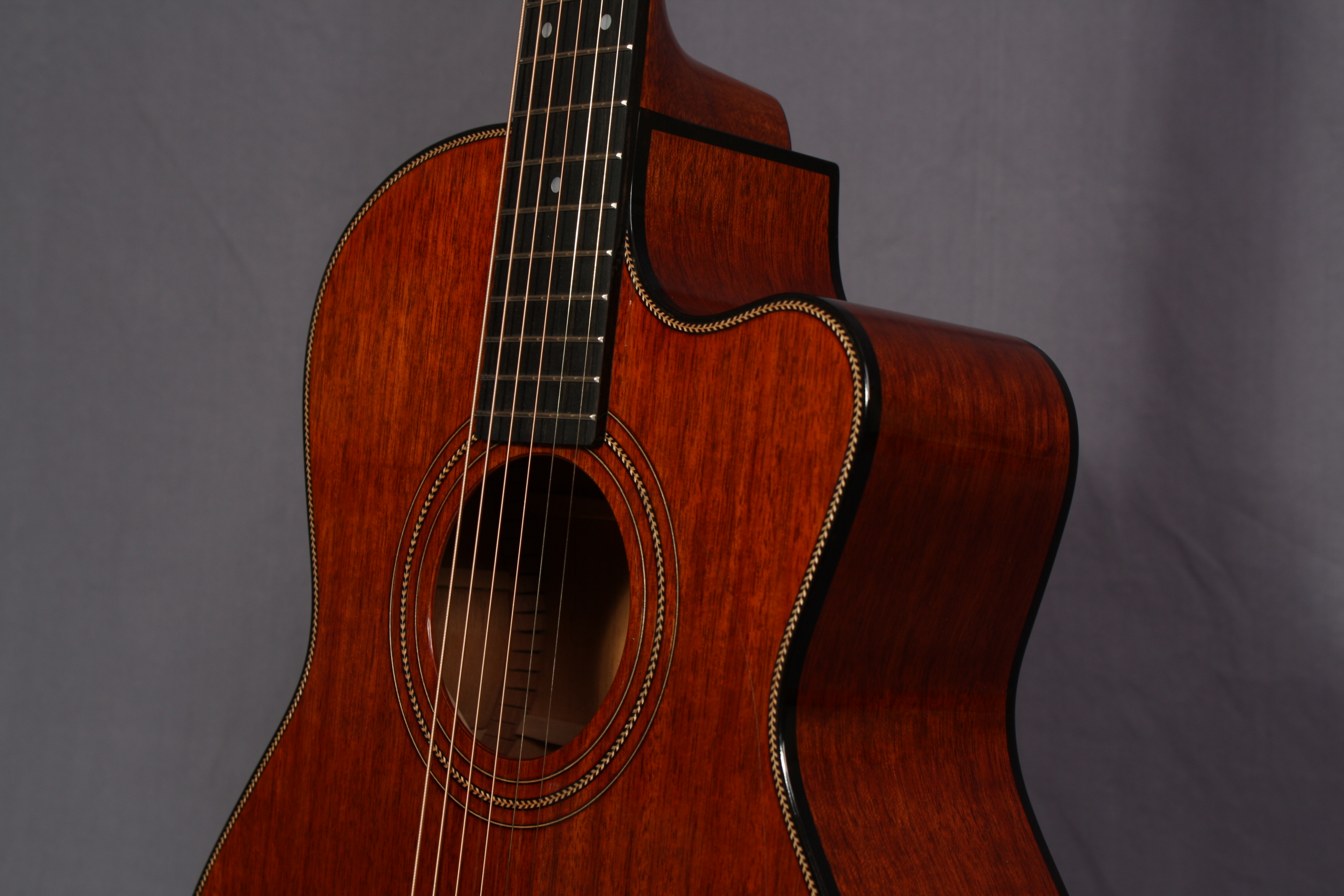 My L-Model is shaped like the Gibson L’s of the 1930’s but with an updated interior structure in that the back and soundboard (as on all of my steel strings) are built to 15′ radius and 30′ radius spherical sections, respectively. On this model I always used a 24.75″ scale. Yes, I have also made a L-Model with a venetian cutaway.